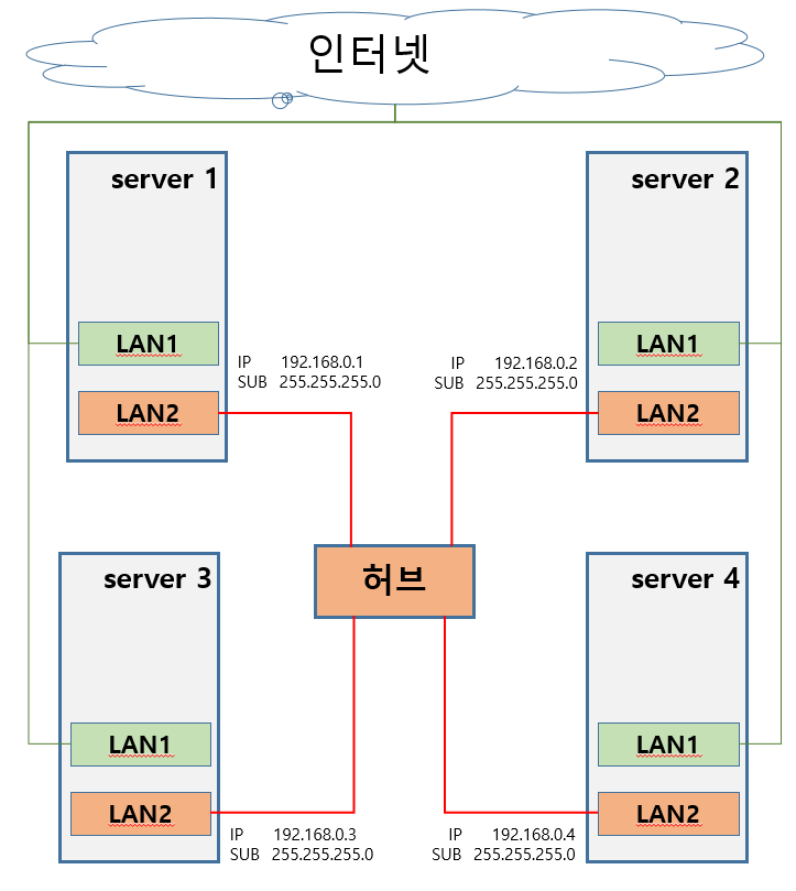 핵심은 기가 지원하는 장비를 사용해야 한다는 점과 LAN2는 외부망 연결 없이 서버끼리 연결한다는 점입입니다.