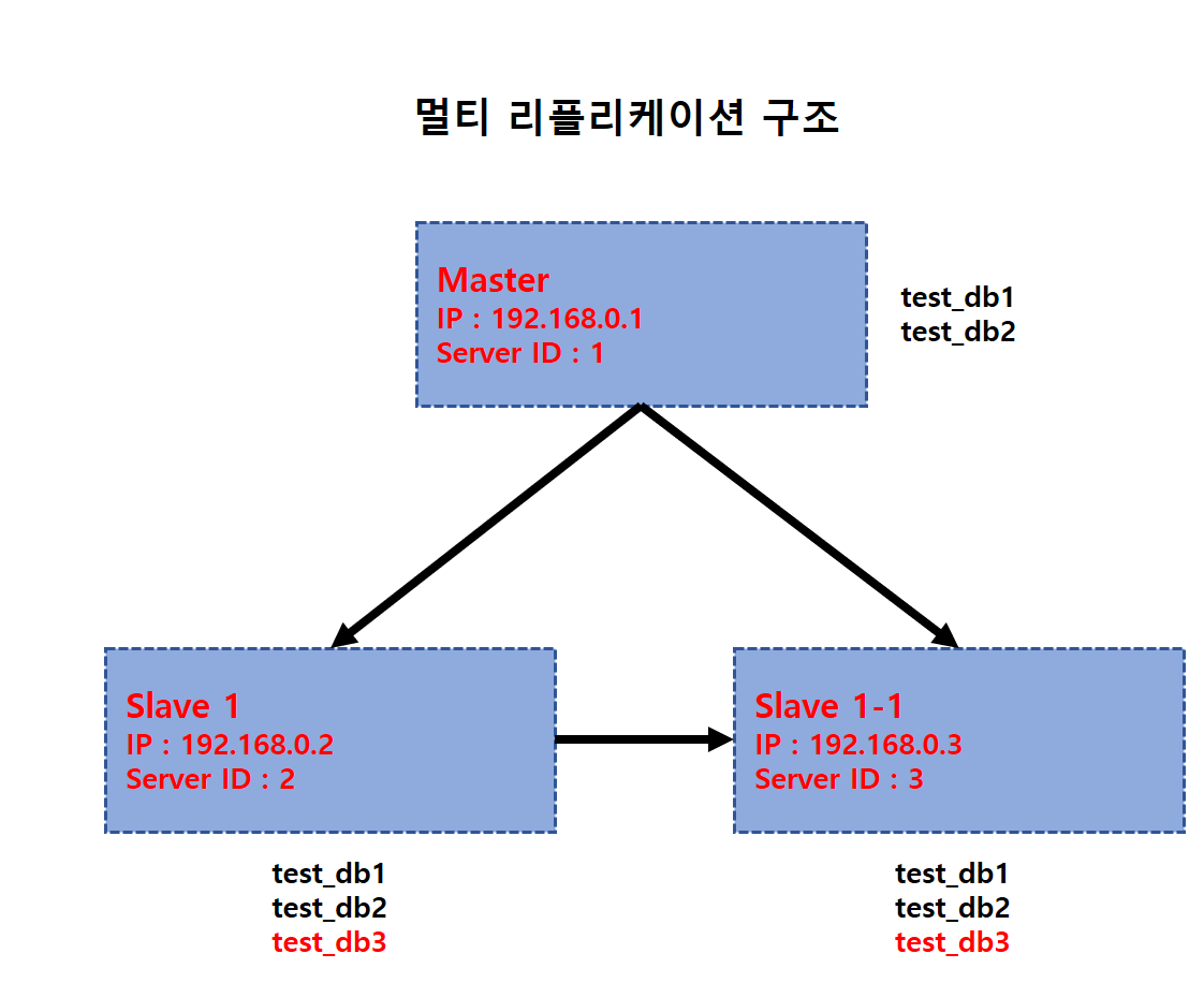 마스터에 test_db1, test_db2가 존재한다고 가정하겠습니다. 슬레이브1은 마스터의 슬레이브이며, 동일하게 test_db1, test_db2가 복제되어있습니다. 슬레이브1에서 test_db3을 생성하였고, 슬레이브1-1 은 마스터와 슬레이브1의 데이터가 모두 적재되도록 설계하였습니다.