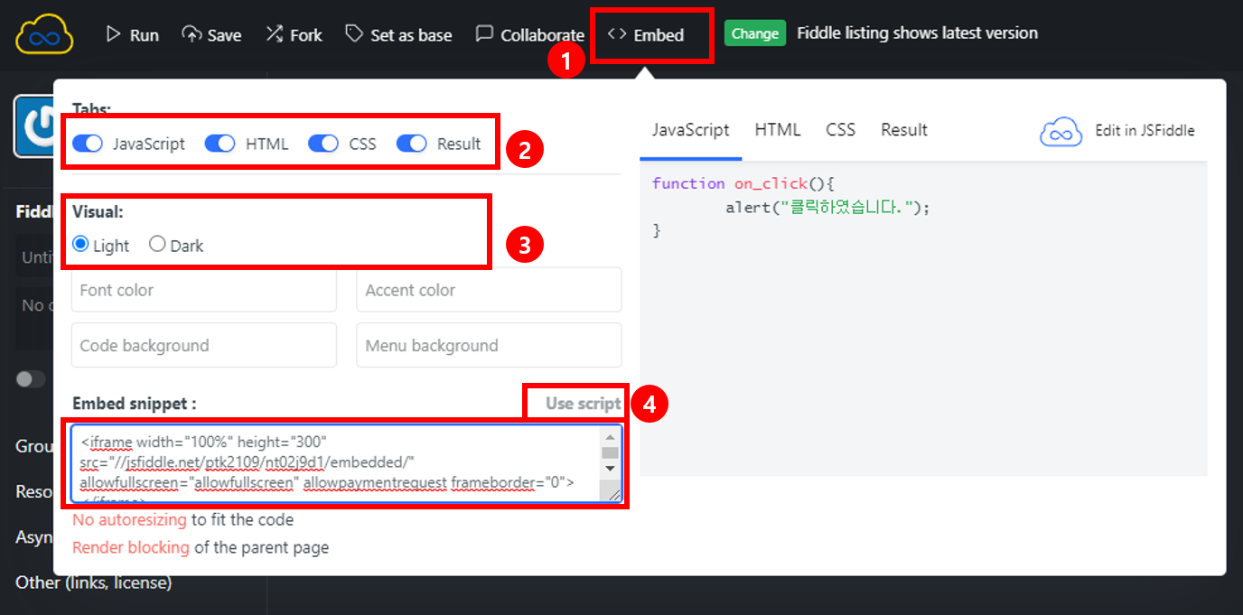 외부에 연결시 밝은 회색 또는 다크모드 중 선택할 수 있습니다. 선택하면 우측화면을 통해 직접 확인할 수 있습니다. - Embed snippet