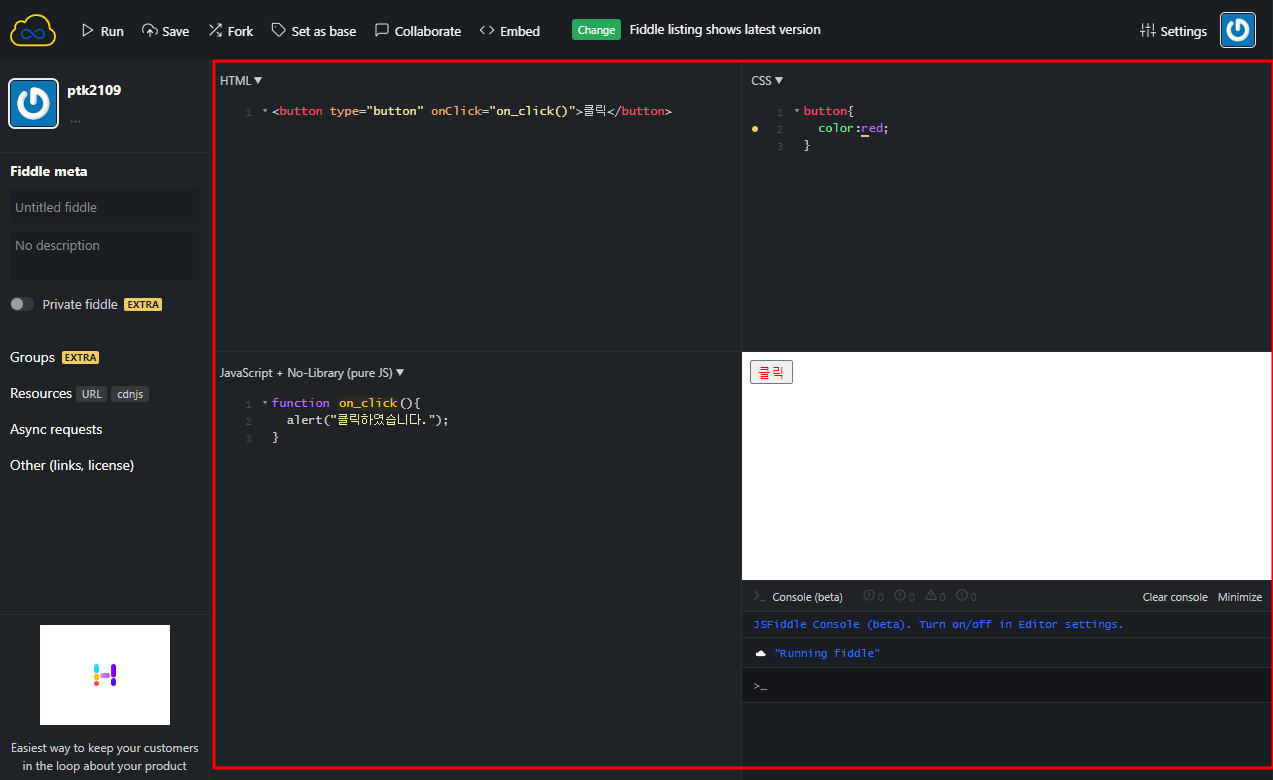 jsFiddle은 프론트엔드인 html, css, javascript 를 작성하여 빠르게 결과를 확인할 수 있고, 이를 테스트 및 공유할 수 있는 서비스를 제공합니다.